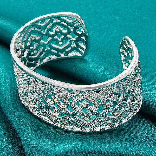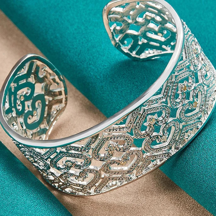 Express your style with the ISHTARÉA bracelet, a sophisticated and timeless openwork silver cuff bracelet. Its finely crafted motif, composed of intertwined and openwork shapes, creates a delicate play of light that elegantly enhances the wrist.