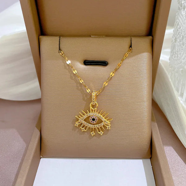Apporte une touche de protection sacrée et d’élégance solaire à ton style avec le collier NAYRA, un collier œil protecteur doré au design raffiné et symbolique. Son pendentif en forme d’œil bleu central, entouré de pierres scintillantes et sublimé par de délicates franges dorées, évoque la vigilance, la lumière et la force intérieure.
