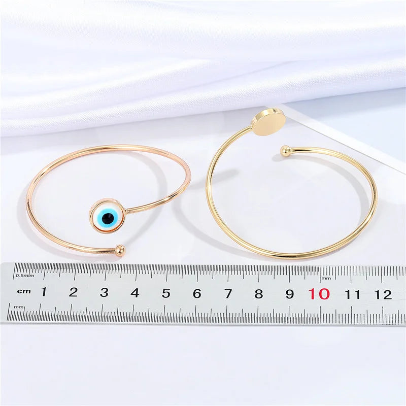 Aggiungi un tocco di protezione ed eleganza al tuo polso con questo bracciale rigido in acciaio inossidabile color oro con occhio protettivo. Minimalista e raffinato, è decorato con un occhio blu protettivo, un antico simbolo noto per allontanare il malocchio e attrarre energia positiva.
