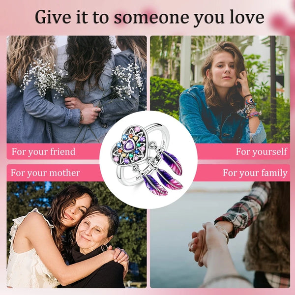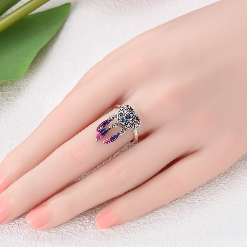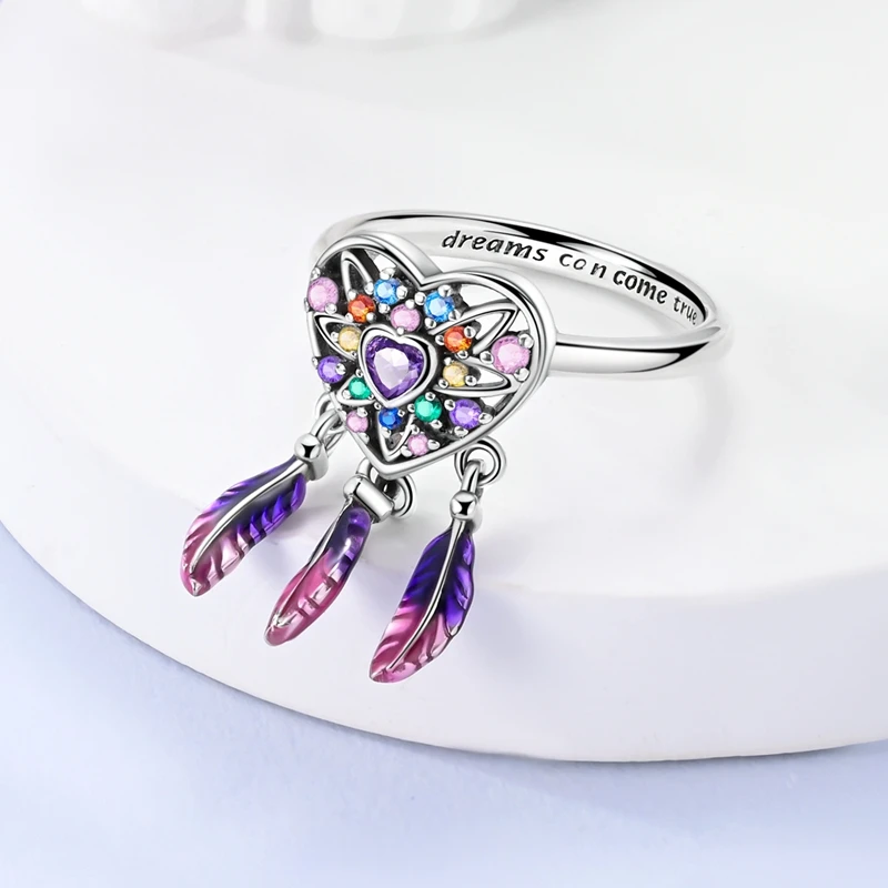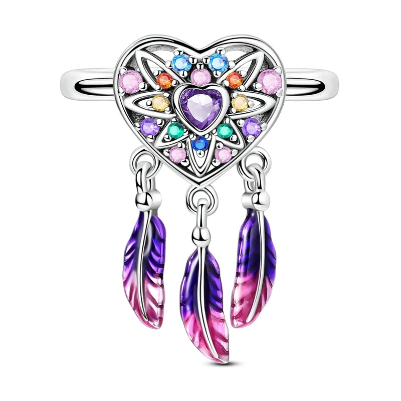 Lascia che la magia si manifesti con l'anello Dream Heart, una creazione ispirata agli acchiappasogni e al mondo bohémien. Il cuore centrale, impreziosito da una pietra viola, è impreziosito da una serie di pietre multicolori delicatamente incastonate, mentre tre piume pendenti nei toni del viola e del rosa aggiungono movimento e poesia.