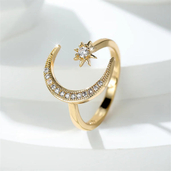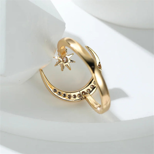 La bague SELENA est une invitation à la rêverie et à la magie céleste. Son design raffiné associe une lune croissante pavée de cristaux scintillants à une étoile lumineuse, symbole d’espoir et de guidance. Sa finition dorée éclatante capte la lumière avec élégance et sublime la main avec délicatesse.