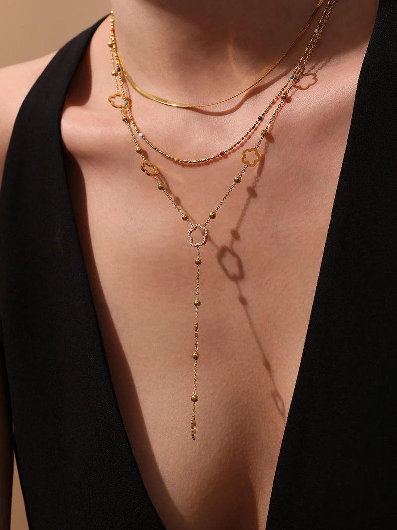 Ce collier multi-rangs doré est idéal pour illuminer une tenue, qu’elle soit minimaliste ou sophistiquée. Un bijou chic et moderne, pensé pour celles qui aiment les détails fins et les bijoux qui attirent le regard sans en faire trop.